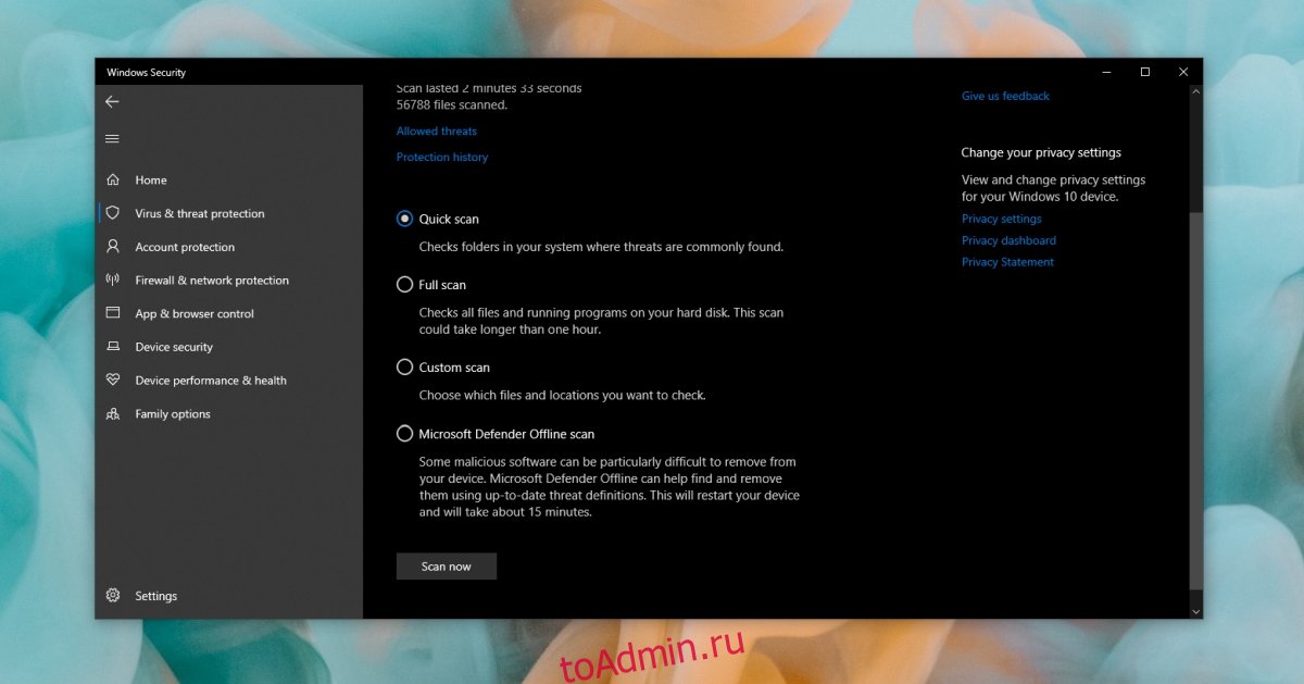 Откройте Защитник Windows.Перейдите на вкладку Защита от вирусов и угроз.Щелкните Параметры сканирования.Щелкните Сканировать сейчас.Просканируйте всю систему и удалите все обнаруженные инфекции.