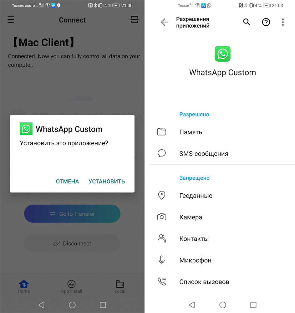 Приложение само установит специальную версию WhatsApp на время переноса. Потом её можно будет удалить