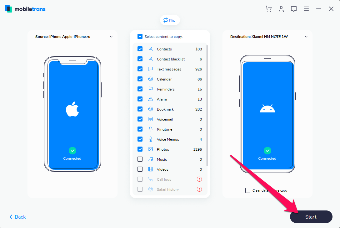 Все категории данных для переноса важно выбрать перед нажатием кнопки Start. Тогда получится, например, перенести на новый смартфон исключительно нужную информацию