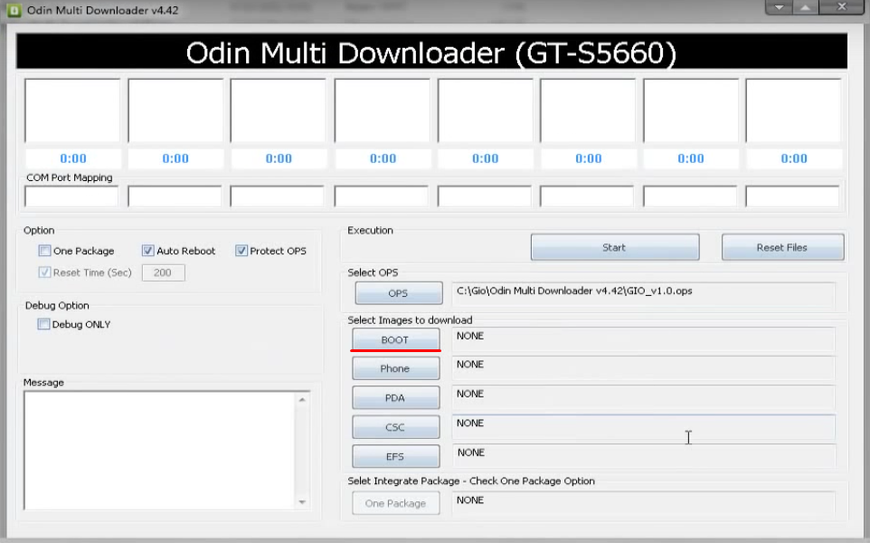 Затем выбираем версию прошивки, которую мы хотим установить на устройство. Для этого нажимаем на кнопку «ВООТ» и в диалоговом окне ищем папку с вашей прошивкой, где выделяем файл имеющий в своем названии слово ВООТ и т.д.