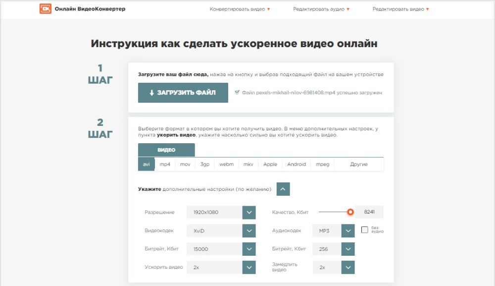 Данный сервис нацелен в первую очередь на конвертирование видеофайлов, но также здесь можно найти функции для изменения свойств медиафайлов. В том числе на сайте можно ускорить видеоролик до 3х раз буквально парой нажатий мышки. Сервис работает в бесплатном режиме и отличается удобным интерфейсом полностью на русском языке. Ограничений на размер загружаемого видеофайла нет.