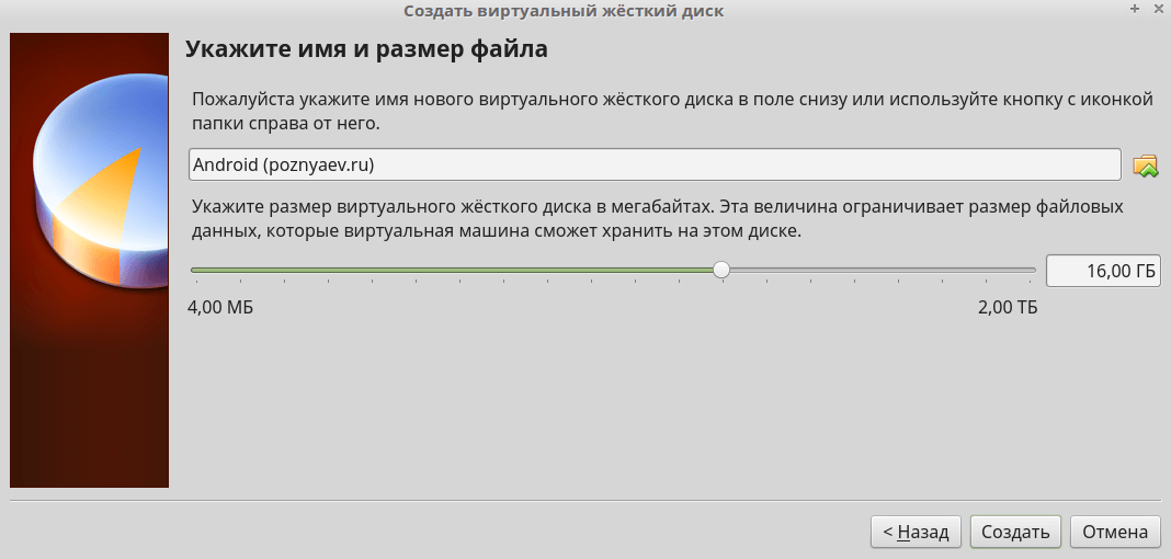 Объем жесткого диска — не менее 16 гигабайт. Это соответствует размеру достаточно скромного накопителя современного телефона. Нажмите «Создать».