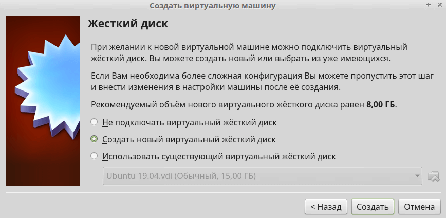 Оставьте предлагаемый по умолчанию вариант «Создать новый виртуальный жесткий диск» и нажмите кнопку «Создать».