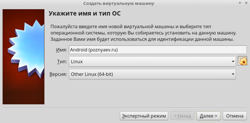 Задайте новой виртуальной машине понятное имя и выберите в качестве операционной системы Linux 2.6/3.х (32 bit). Нажмите на Next.