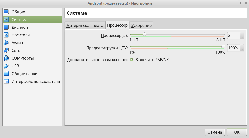 После создания виртуальной машины, щелкните по ней правой кнопкой мыши и выберите пункт «Настроить». В разделе «Система» на вкладке «Процессор» при помощи ползунка выделите виртуальной машине не менее двух ядер центрального процессора.