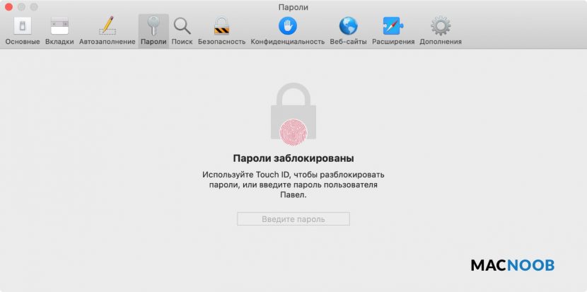 - Перейдите на вкладку «Пароли» и введите код от Mac или подтвердите свою личность через Touch ID.