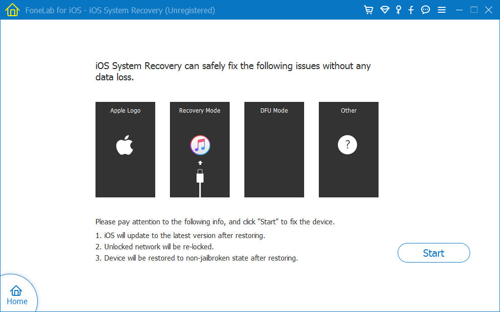 Программное обеспечение может обнаружить, что подключенный iPhone находится в ненормальном состоянии, и попросит вас нажать Start чтобы начать.