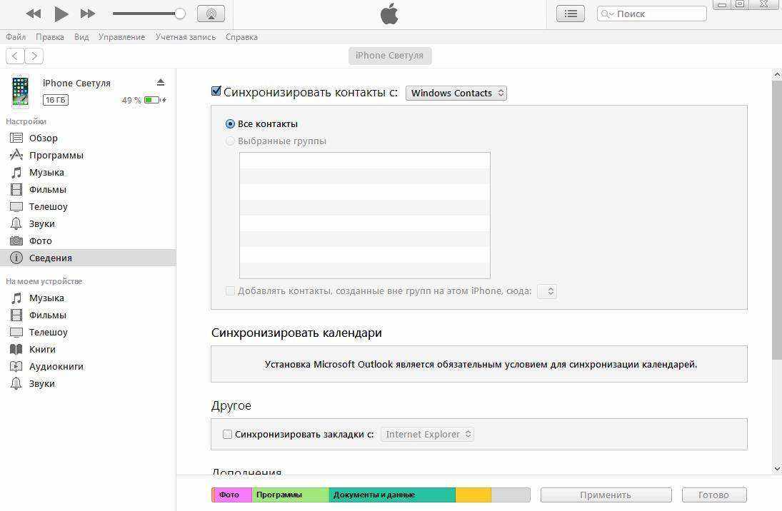 2. В левой панели нажмите на вкладку «Сведения». В открывшемся окне поставьте галочку напротив пункта «Синхронизировать контакты с. » и выберите, с какой программой на компьютере вы хотите синхронизировать вашу телефонную книгу. Нажмите «Готово».