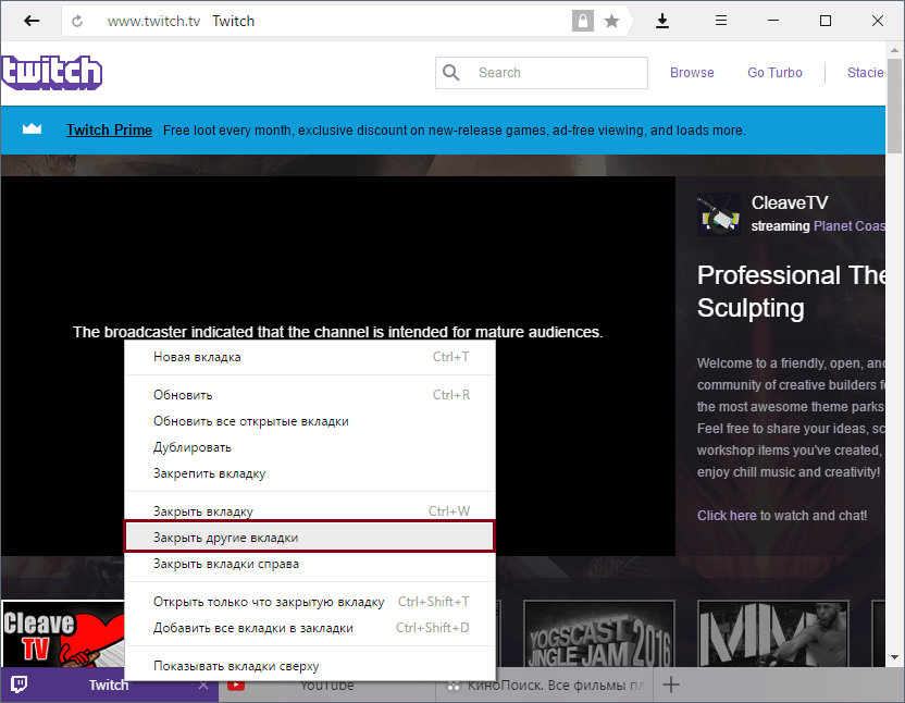 Браузер умеет закрывать все вкладки за раз кроме текущей. Соответственно, вам нужно перейти на ту вкладку, которую вы хотите сохранить, нажать по ней правой кнопкой мыши и выбрать пункт «Закрыть другие вкладки ». После этого все вкладки будут закрыты, останется лишь только текущая вкладка, а также закрепленные вкладки (если они есть).