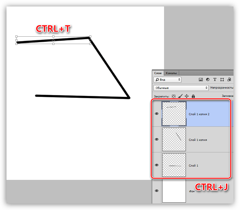 после чего, путем копирования слоев (CTRL+J) и опции «Свободное трансформирование», включаемой нажатием клавиш CTRL+T, создать необходимую фигуру.
