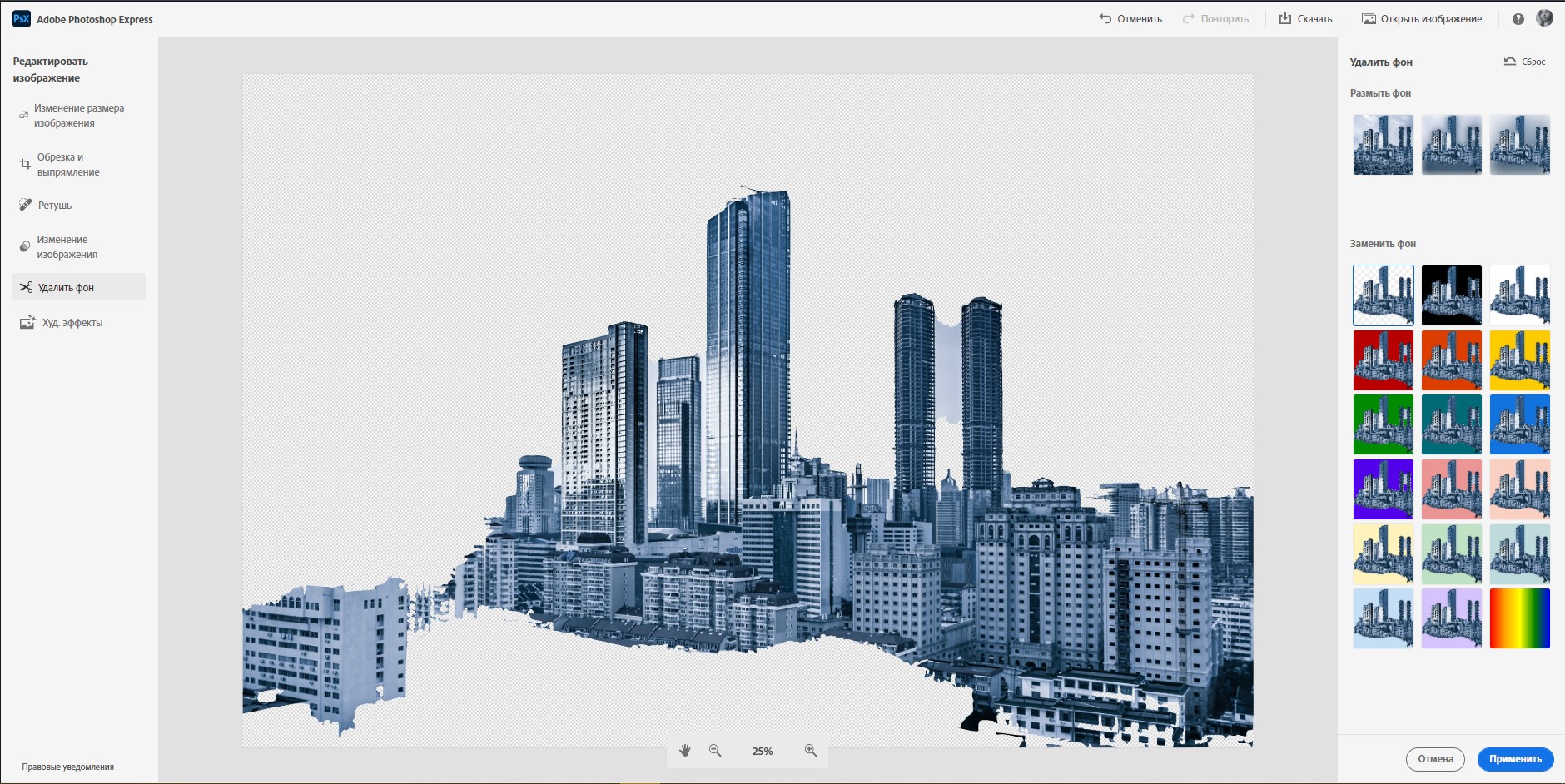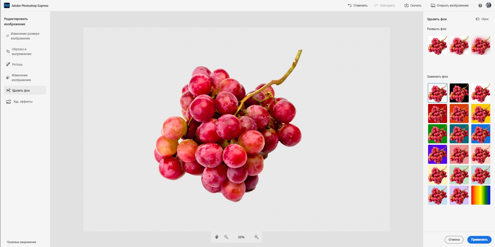 Adobe Photoshop Express — это бесплатный онлайн-редактор, который работает прямо в браузере. Ничего скачивать и устанавливать не нужно. Для того чтобы убрать фон с картинки, здесь есть специальная кнопка, расположенная на панели слева. Загружаем фото, нажимаем «Удалить фон». Вуаля! Интеллект Фотошопа сам отделяет фон, и выглядит все довольно аккуратно. Теперь можно применить изменения и скачать картинку без фона. Большой плюс онлайн-версии в том, что она сохраняет изначальное качество фото. А еще это полностью бесплатно.