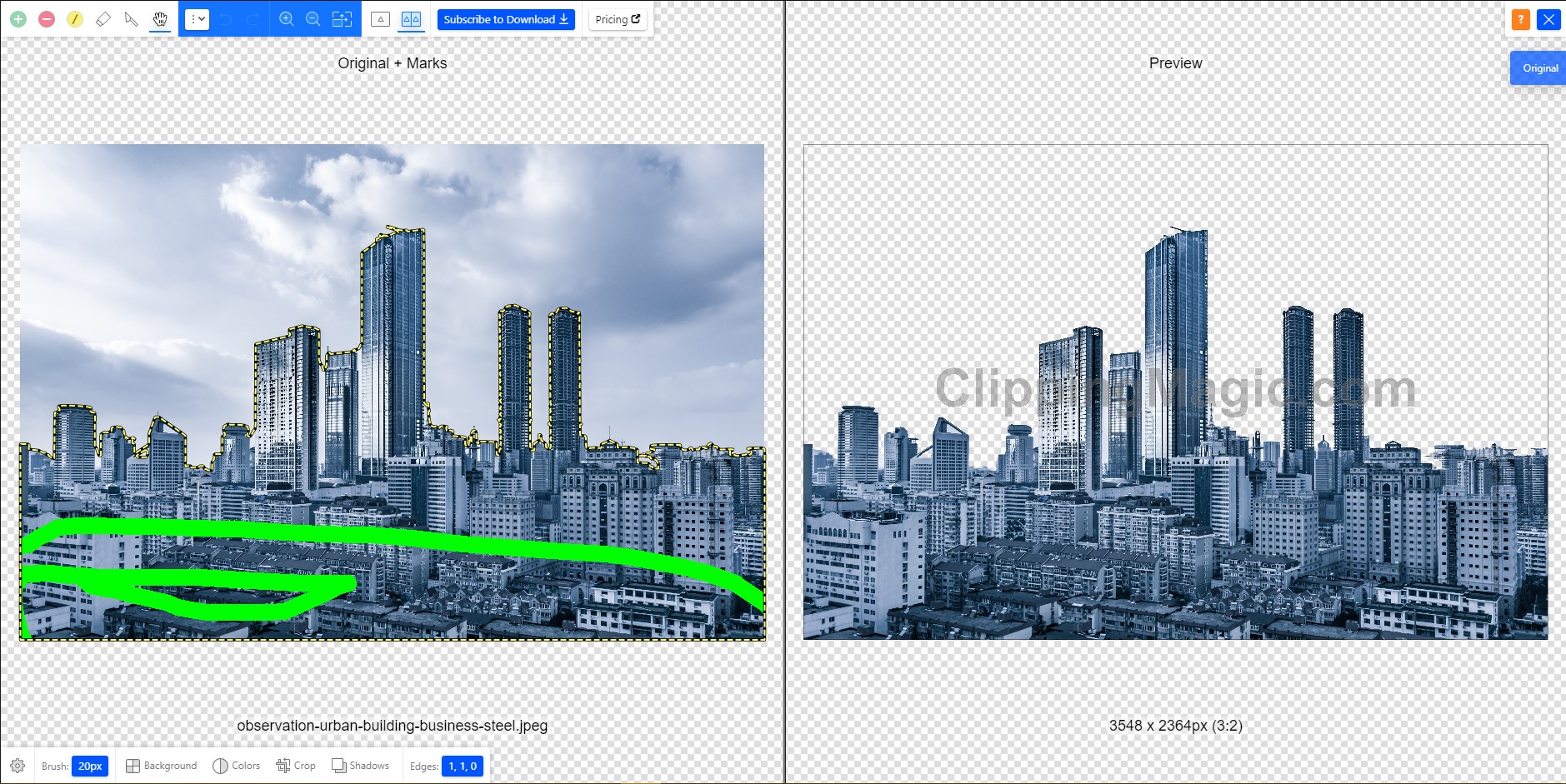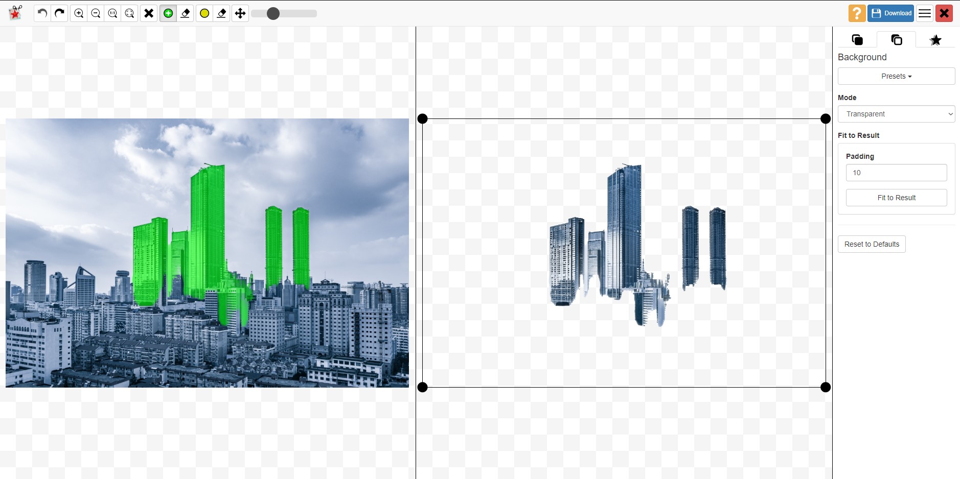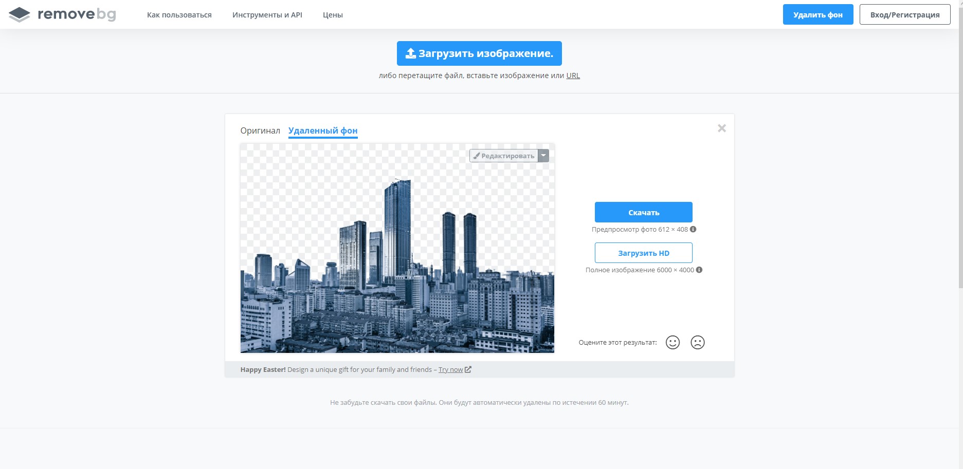Минус в том, что изображение в исходном качестве можно сохранить, только если у вас есть оплаченная подписка на сервис. В противном случае придется довольствоваться низким разрешением. Но посмотрите, как качественно сервис смог вырезать фон с нашей фотографии с городом. Небо было в таком же цветовом диапазоне, что и здания, но RemoveBG справился со своей задачей успешно.