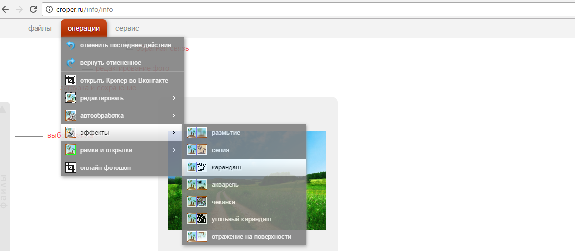 - Кликните по очереди на «Операции»—«Эффекты»— «Карандаш».