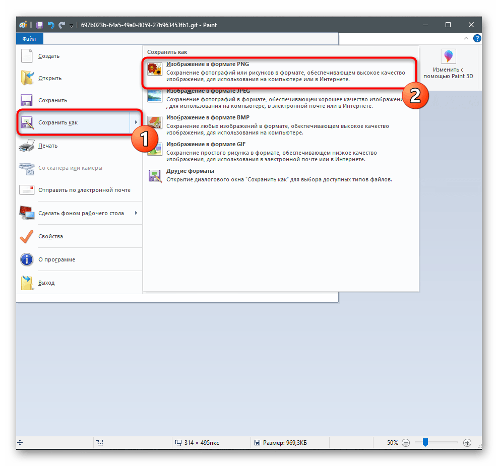 Снова откройте меню «Файл», наведите курсор на «Сохранить как» и выберите вариант «Изображение в формате PNG».