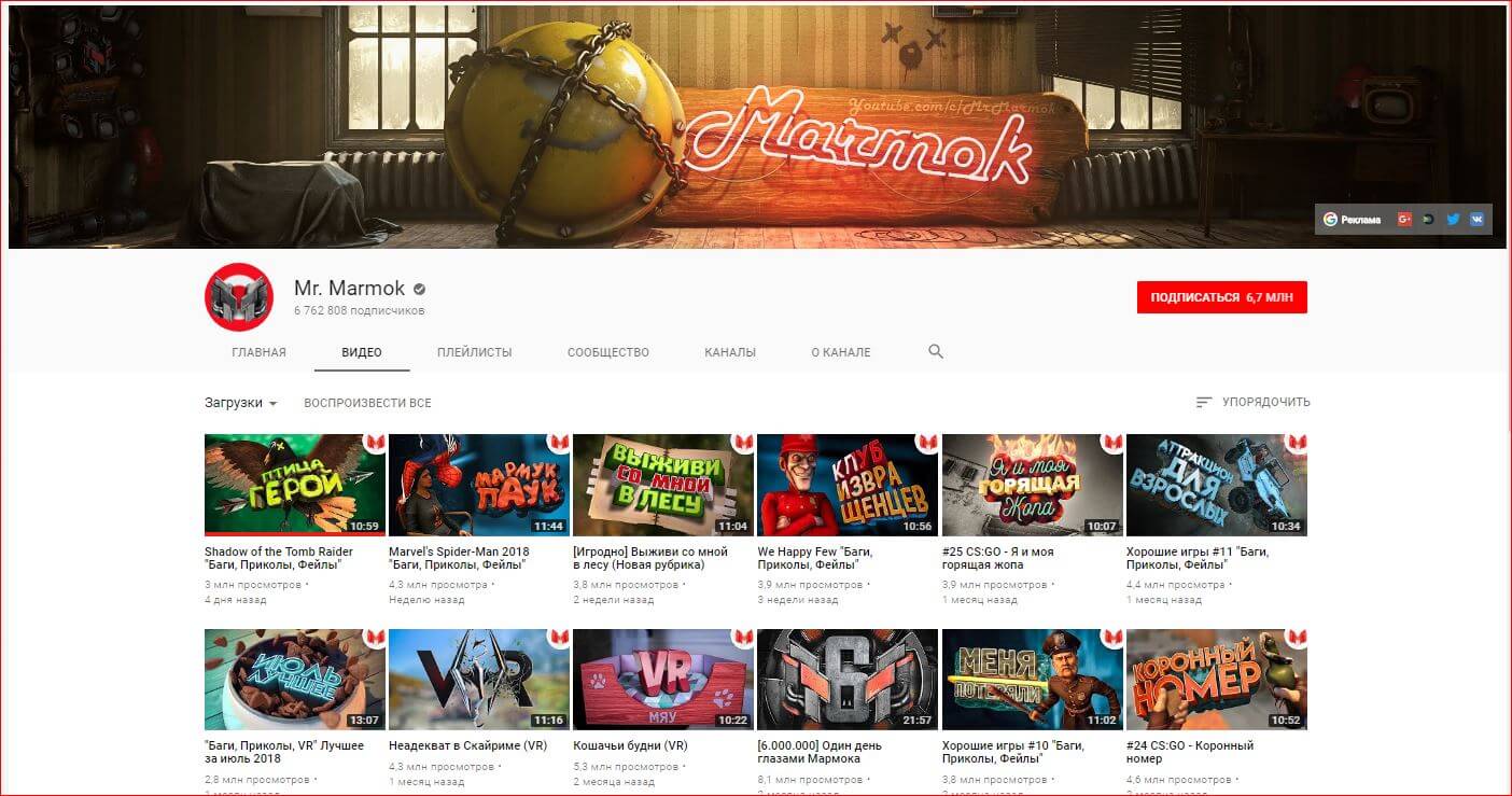 Очень крутое оформление страницы у Mr. Marmok, с 6,7 миллиона подписчиков. Развлекательный игровой аккаунт. Успех в смешной озвучке видео игр и качестве роликов. Видно, что над оформлением серьёзно поработали. На каждый ролик установлена стильная обложка, крутые фирменные видео заставки – интро Мармока сделаны на высочайшем уровне.