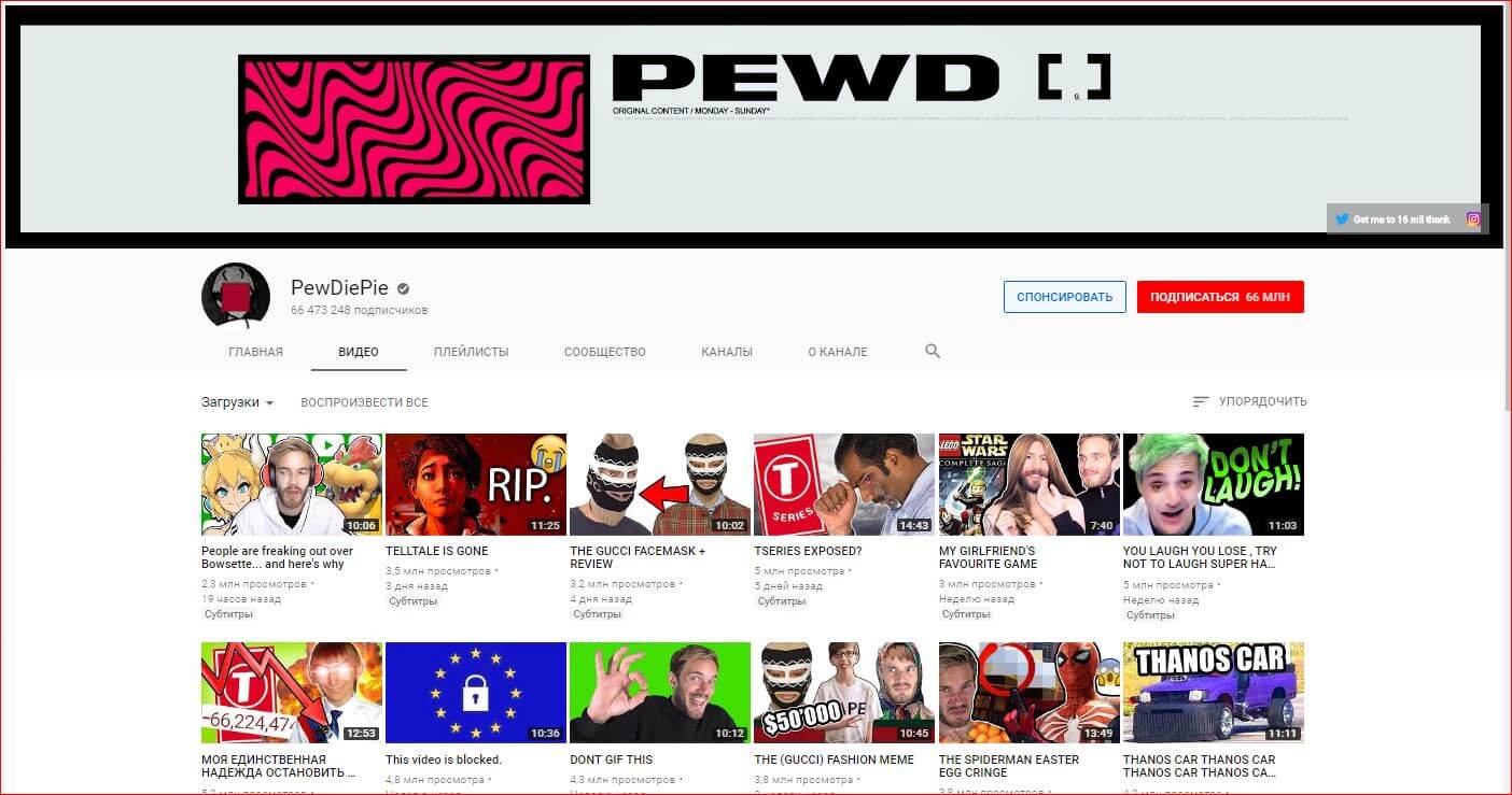 А вот шапка его канала в те дни, когда у PewDiePie было 35 миллионов подписчиков: