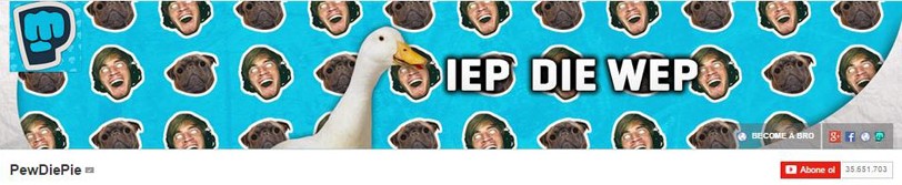 И вот шапка канала Pewdiepie, которая, похоже, была у него продолжительное время на заре его деятельности. Сколько, точно не могу сказать, но точно знаю, что эта шапка была, когда у него было 10 и 28 миллионов подписчиков. Видел скриншоты в Интернете.