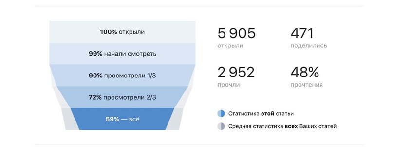 Статистика покажет, на что стоит обратить внимание. Считаются все нужные метрики, включая классическую «воронку» — Вы узнаете, сколько пользователей осилили весь текст, а сколько сдались на середине