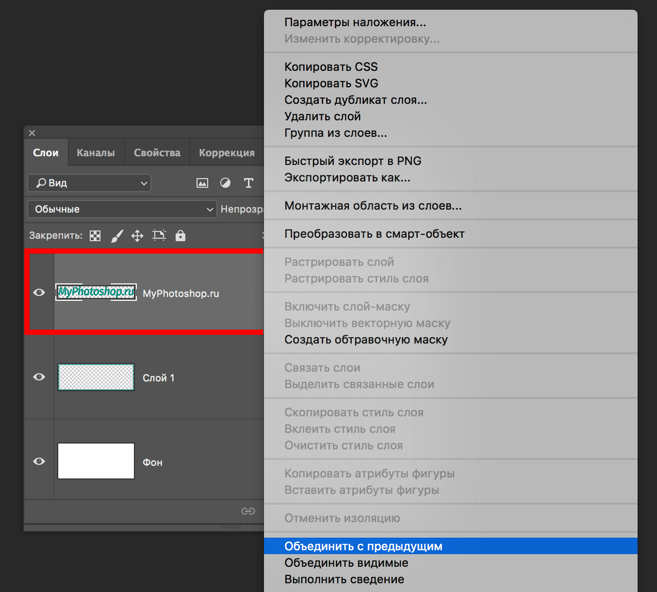 После, нужно снова нажать на растрированный слой с текстом ПКМ и выбрать “Объединить с предыдущим”, как показано на скриншоте ниже: