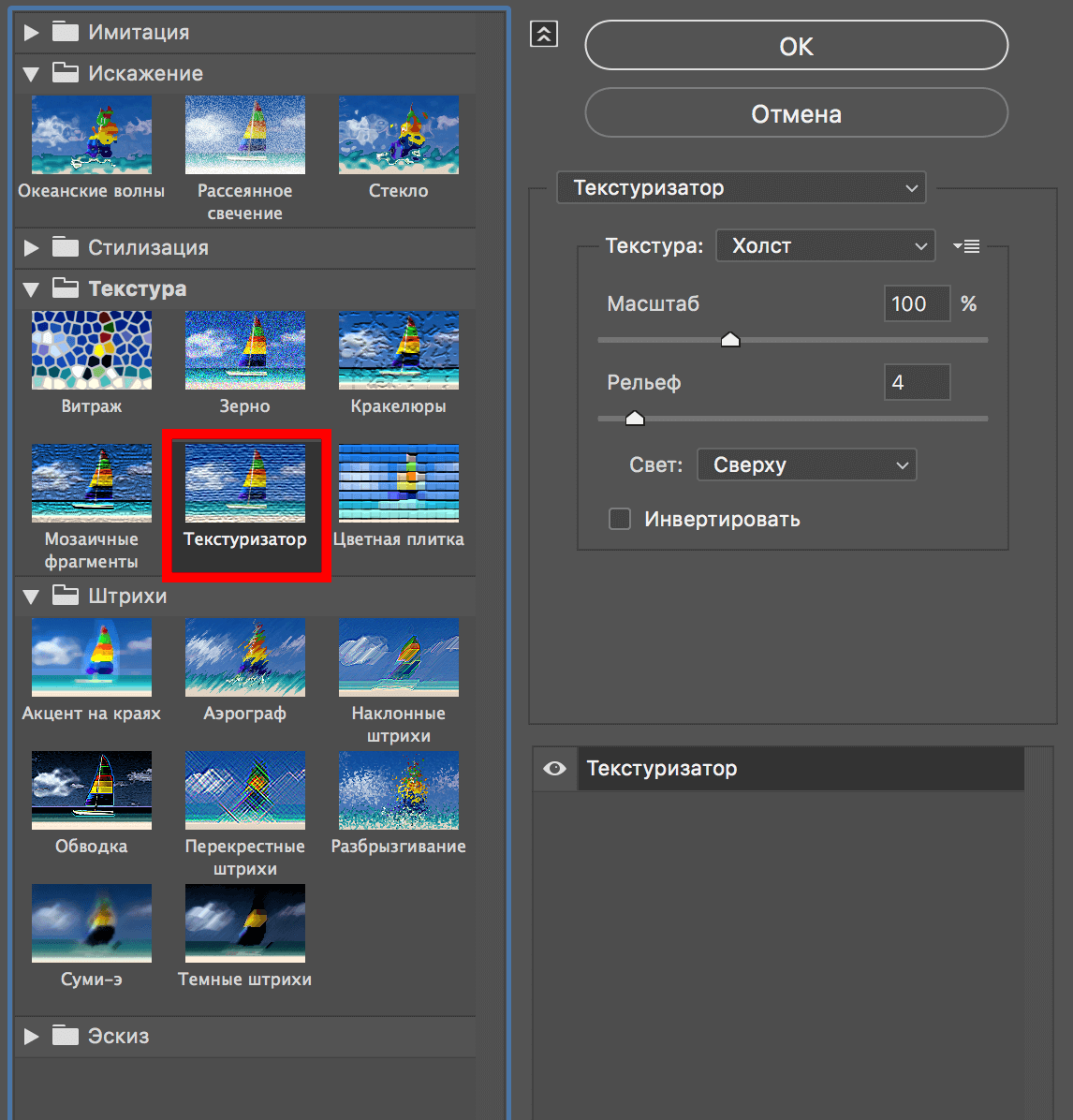 Вернемся к нашей галерее эффектов. Находим подраздел “Текстура” и выбираем “Текстуризатор” (Вы можете выбрать любой другой эффект). Устанавливаем необходимые настройки для этого фильтра и кликаем ОК.