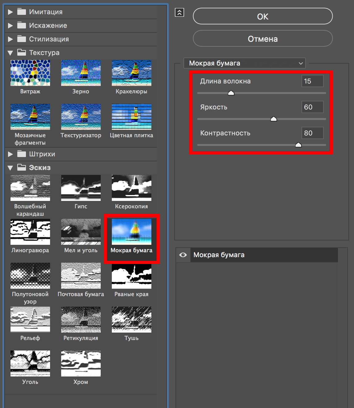 Еще раз заходим в меню “Галерея фильтров” и добавим еще один эффект – “Эскиз” -> “Мокрая бумага”.