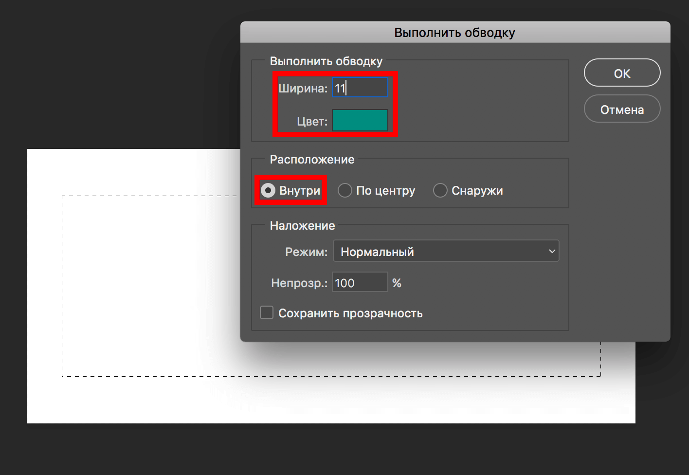 В открывшемся окне настроек мы выставим наш фирменный цвет и ширину в 11 пикселей. В пункте “Расположение” выбираем “Внутри”. Вы же, в свою очередь, экспериментируйте и выбирайте те настройки, которые подходят вам.