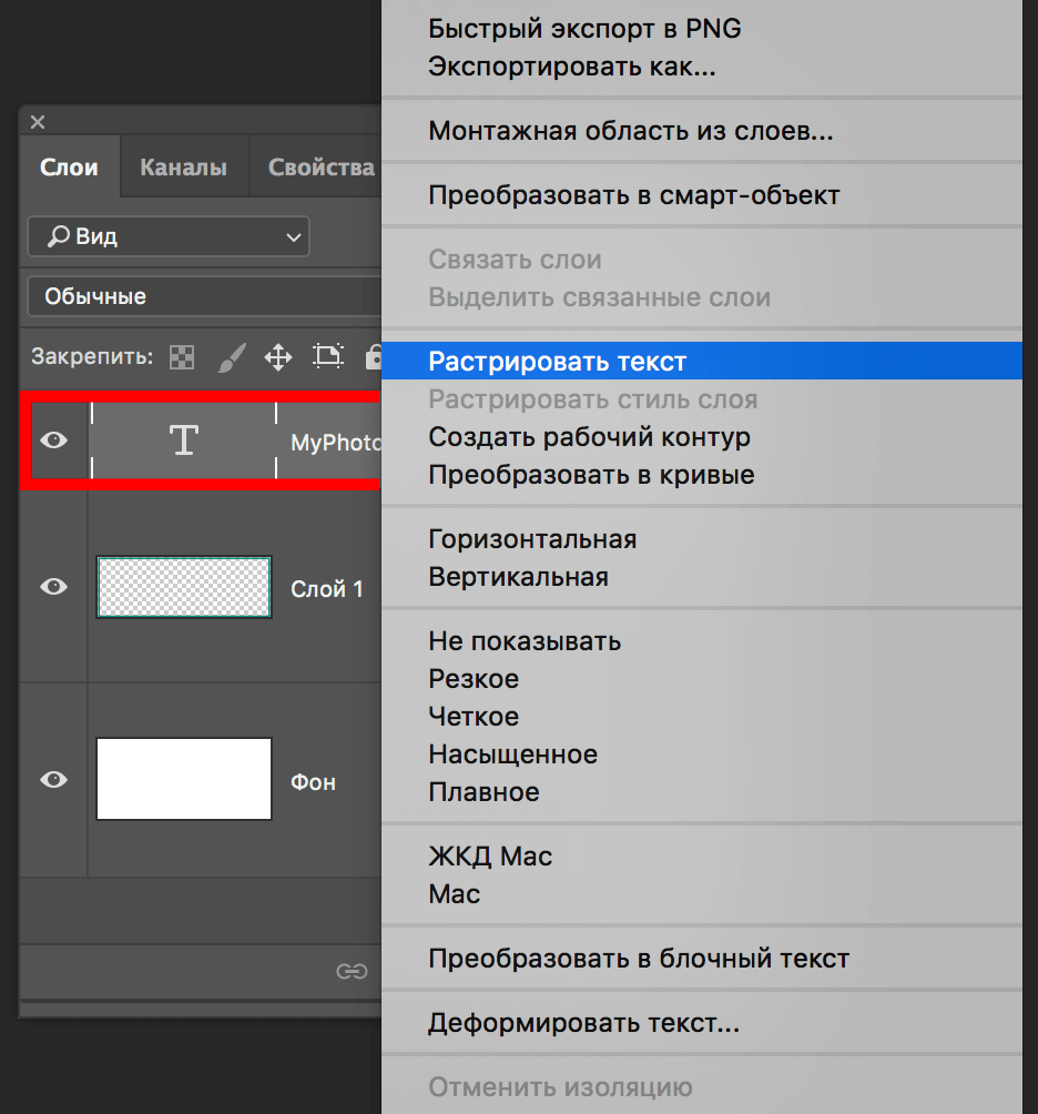 Чтобы начать обработку текста, нужно его растрировать. Для дальнейшей обработки текст необходимо растрировать. Для этого просто кликните на слой, где находится текст ПКМ и в раскрывшемся меню выберите “Растрировать текст”.