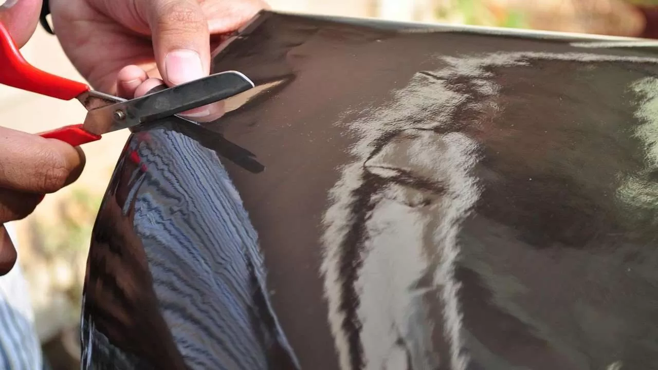 Для того, чтобы пленка приклеилась идеально и с ней было легче работать нужно вырезать ее по размеру. Перед началом поймите, с какой стороны липкий слой. Он должен быть защищен прозрачным материалом. Вырезать лучше всего таким образом, чтобы к стеклу она прикасалась внутренней стороной заворота. При вырезании стоит учитывать, что пленка должна выступать за границу стекла на 0,5-1 см, так как лишний кусок потом можно отрезать, а если его не будет хватать, то будет хуже.
