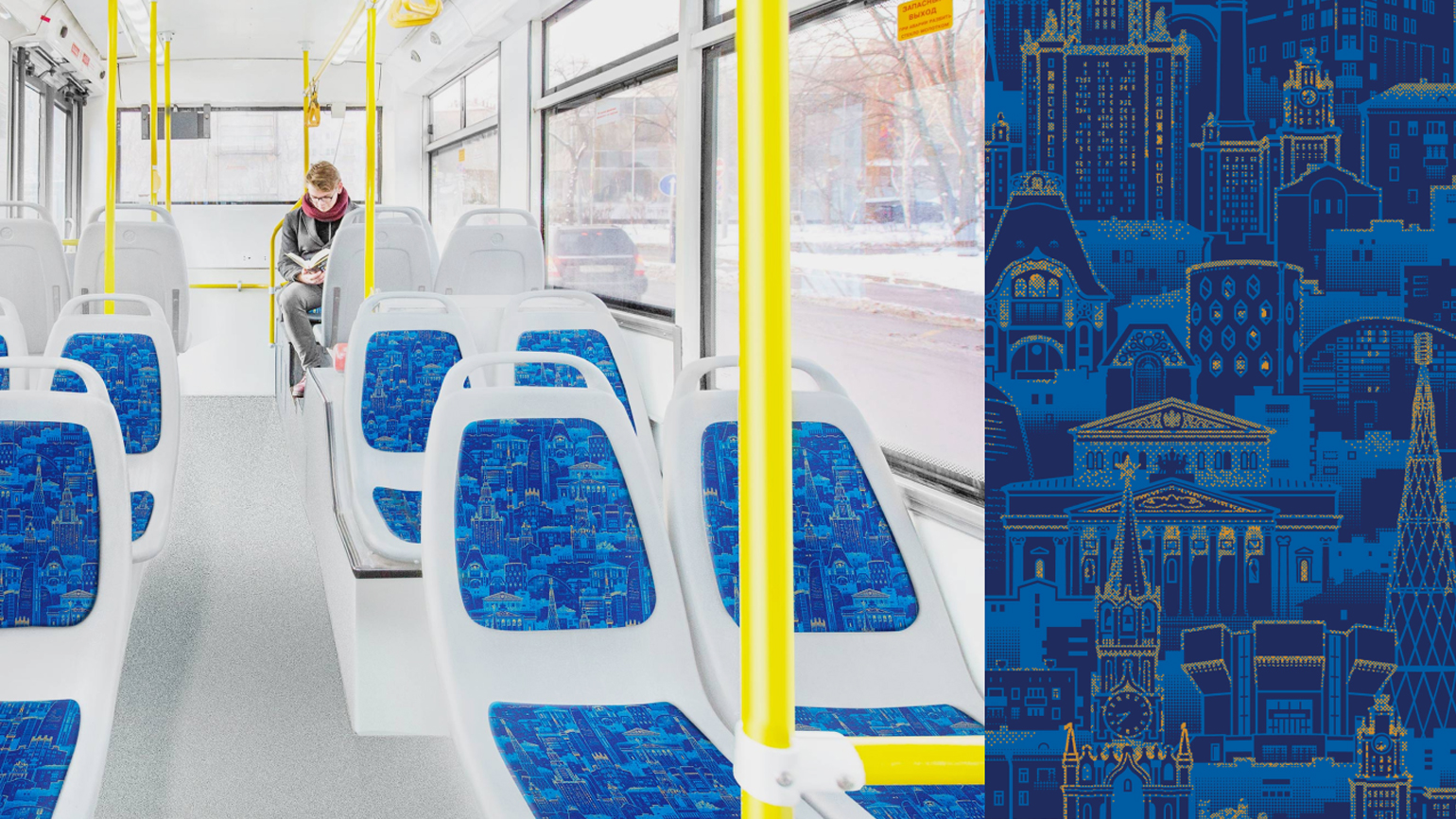 В общественном транспорте паттерны гораздо предпочтительнее однотонной обивки, поскольку узор помогает скрыть грязь и царапины. Например, для московского транспорта в Студии Артемия Лебедева разработали паттерн со знаковыми зданиями Москвы. Его ещё и интересно разглядывать во время поездки.