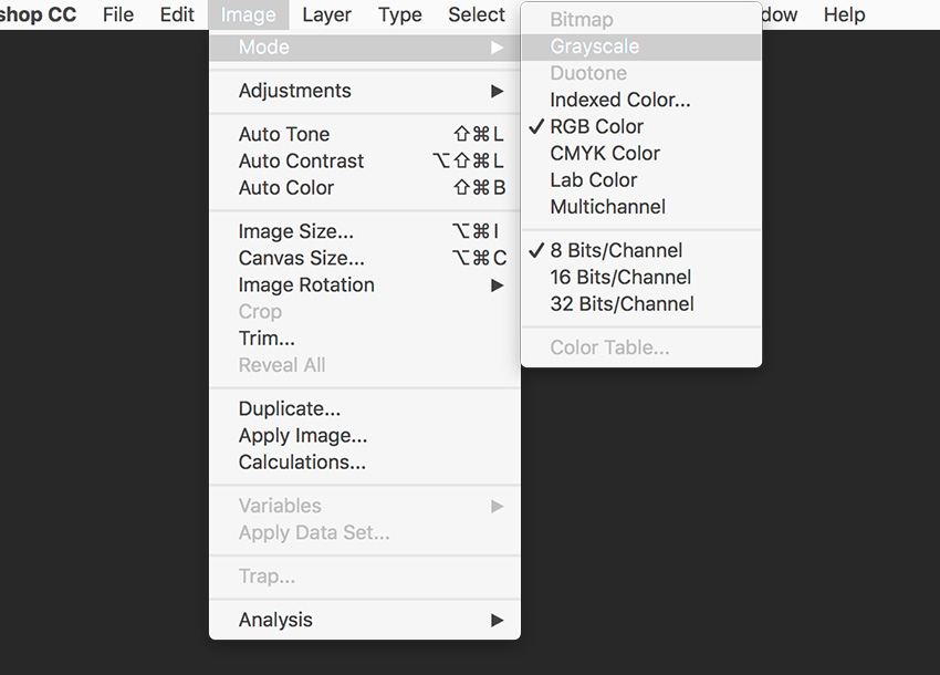 Идем в меню Image – Mode – Grayscale (Изображение – Режим – Градации серого), затем Image – Mode – Bitmap (Изображение – Режим – Битовый формат).