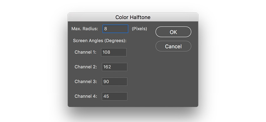 Channels (Каналы) — это голубой, пурпурный, желтый и черный, а также угол, в при котором смешиваются эти цвета. Это делается для достижения определенных цветов и оттенков. Угол создает муаровые эффекты и узоры розеток, которые полезны для печати, где необходимы полутона. В этом уроке мы сосредоточимся на том, как выглядят полутоновые эффекты, которые могут быть напечатаны или использованы в цифровом виде как стиль.