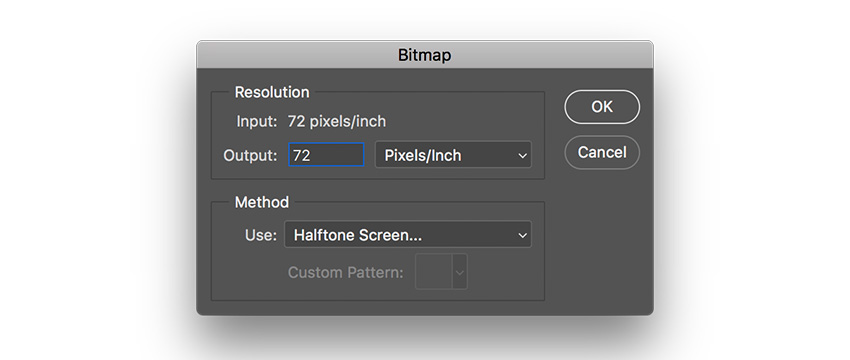 Идем в меню Image – Mode – Bitmap (Изображение – Режим – Битовый формат). В окне параметров Bitmap (Битовый формат), устанавливаем значение Output (Выход) на 72 Pixels/Inch. Method (Способ), Use (Использовать): Halftone Screen (Полутоновой растр) и нажимаем OK.