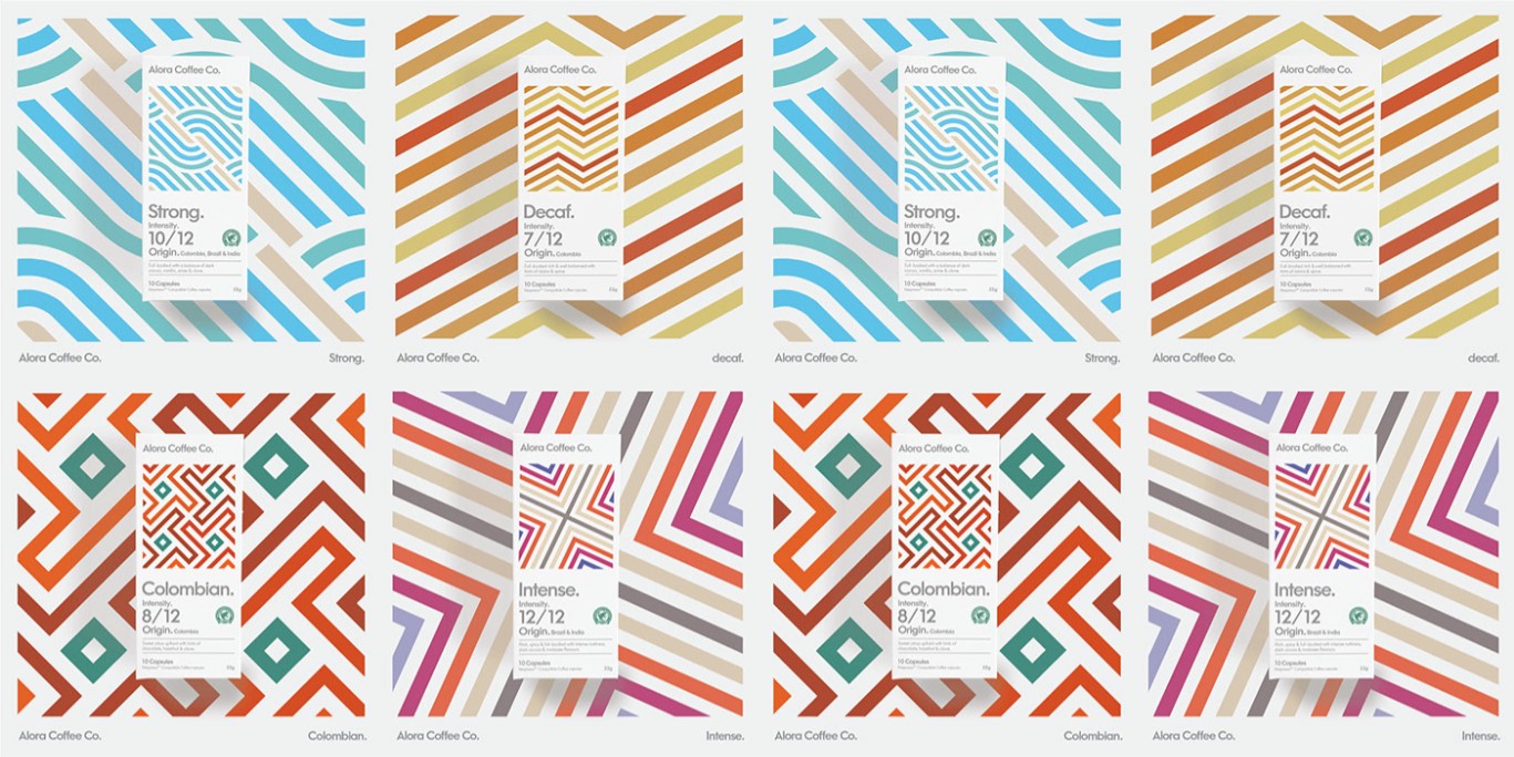 Паттерны – многофункциональная штука. С их помощью можно не только показать, на чем специализируется компания, или отобразить настроение продукта – разными паттернами можно разделить однотипные продукты в линейке. Именно так сделали дизайнеры компании Alora Coffee Co., которая занимается кофейными капсулами. Каждая коробочка имеет свой узор, обозначающий вкус. Легко запомнить!