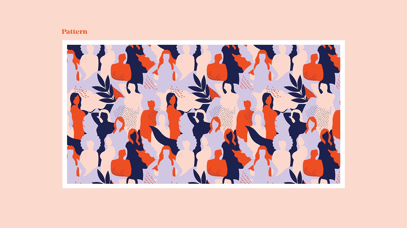 Посмотрите на пример сложного паттерна от Akeme Brand Identity. Здесь переплетаются женские фигуры, точки и листья, и все это в одной цветовой гамме. У этого узора нет швов: его можно продолжить в любую сторону, и он всегда будет выглядеть одинаково.