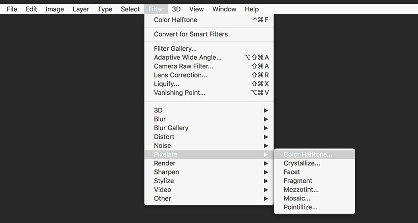 Чтобы получить цветное полутоновое изображение в Photoshop, идем в меню Filter – Pixelate – Color Halftone (Фильтр – Оформление – Цветные полутона).