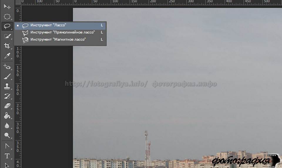Затем выберите инструмент «Лассо». Именно его, а не «Прямолинейное» или «Магнитное лассо».