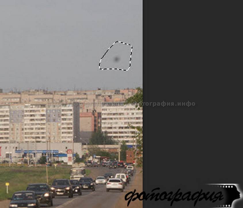 В качестве примера мы возьмем фотографию въезжающих в город автомобилей. В правой части снимка хорошо видно маленькое пятнышко. Его размеры небольшие, но в глаза эта деталь бросается очень сильно. Поэтому хотелось бы от неё избавиться. Некоторые могут подумать, что это летящая вдалеке птица. Но опровергает данное утверждение следующая фотография, полученная с этого же ракурса, но через несколько секунд. Пятнышко на ней находится в том же месте.
