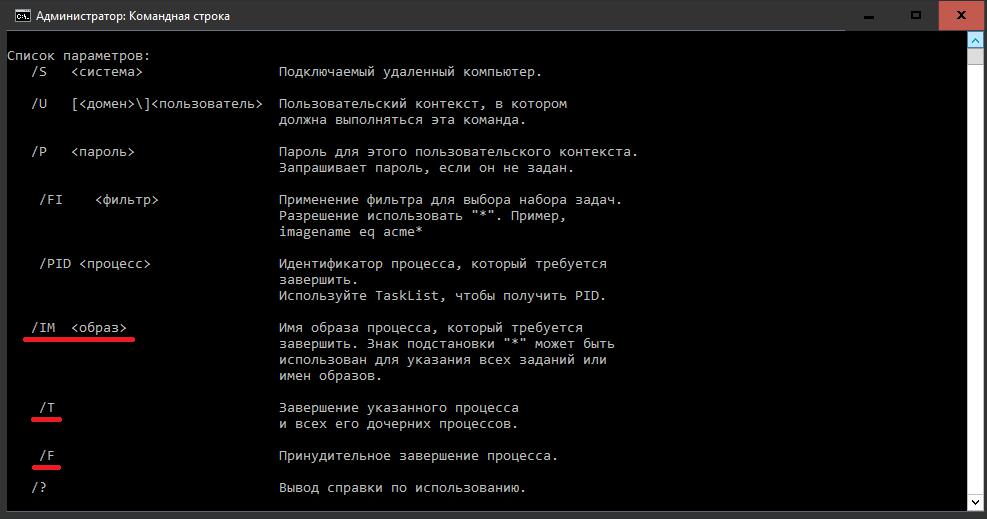 Ее необходимо запустить от имени админа (если учетная запись суперпользователя не отключена), а затем воспользоваться командой taskkill (всю информацию о дополнительных атрибутах можно просмотреть посредством ввода строки «taskkill /?».