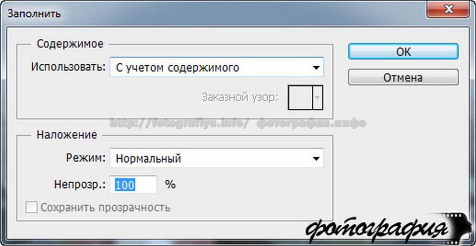 Теперь остается лишь нажать клавишу Delete. Выскочит диалоговое окно. В нём нужно выбрать цвет, которым будет залита выделенная область. Вы должны выбрать вместо цвета пункт «С учетом содержимого». Именно в этом случае программа постарается виртуально продолжить имеющийся фон.