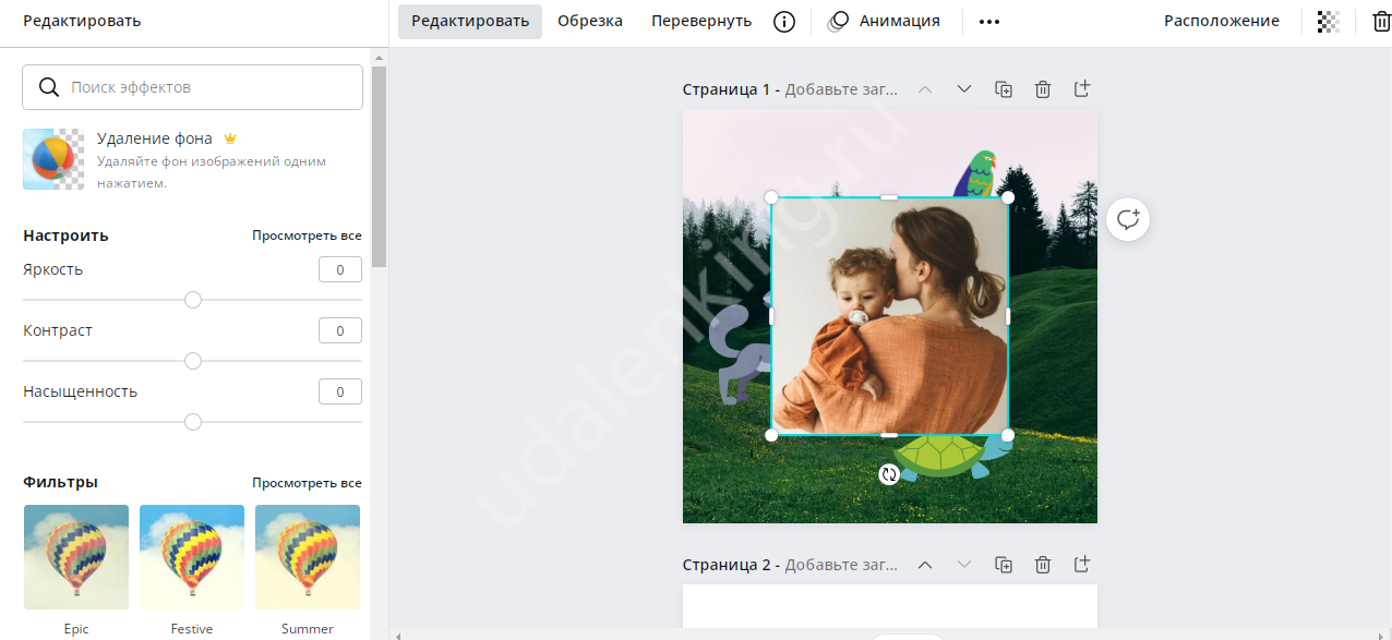 Готово, мы приближаемся к ответу на вопрос, как в Канве обрезать фото по кругу! Теперь просто зажмите картинку курсором и перетащите ее в правую часть экрана. Отредактируйте снимок, если это необходимо, изменив размер, растянув его за углы или перевернув. Также вы можете поработать с яркостью, контрастностью и другими показателями.