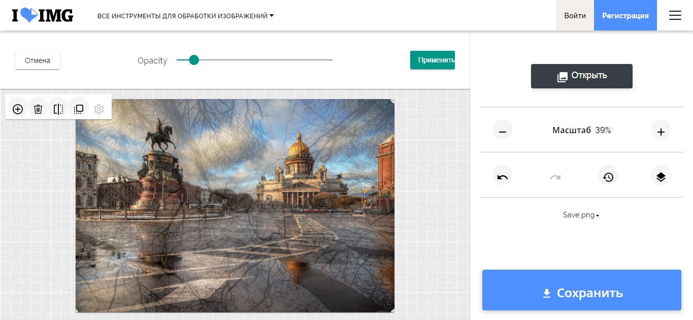 Это сервис, при помощи которого вы сможете не только наложить фото на фото онлайн, но и подвергнуть снимок небольшой коррекции. Провести обрезку, повернуть, применить фильтр или добавить текст. При конвертации качество изображения сохраняется, а копии файлов, с которыми вы работали, удаляются с сервера через два часа. Именно поэтому вы можете не боятся, что ваши снимки станут доступны кому-то еще и останутся свободно «болтаться» в сети.