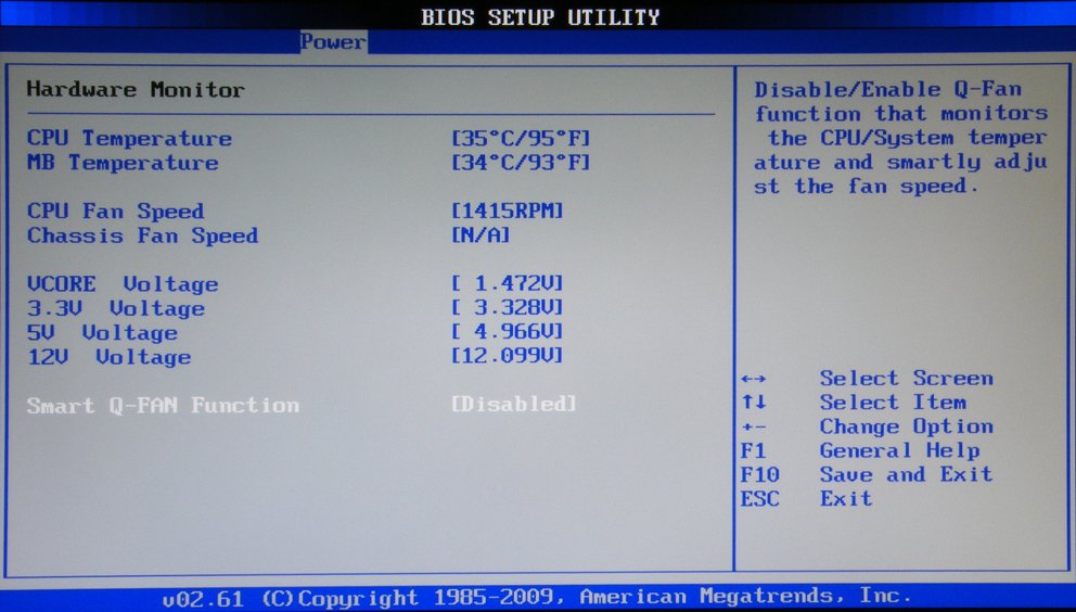 - После загрузки Биоса необходимо перейти при помощи стрелки во вкладку «Power» и посмотреть на параметр «Hardware Monitor». Также этот параметр может иметь название «Status» или же «PC Health Status», а в большинстве современных ПК параметр temperature расположен в левой части экрана настроек. Однако в старых устройствах данный параметр в принципе отсутствует.