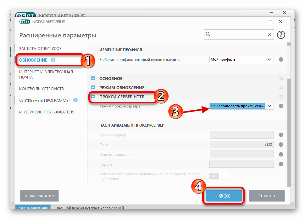 Проблемы с загрузкой могут возникать и из-за невозможности подключиться к серверу (может появиться сообщение «ESET NOD32 обновление модулей не выполнено»). В этом случае для исправления неполадок выполните следующие шаги: