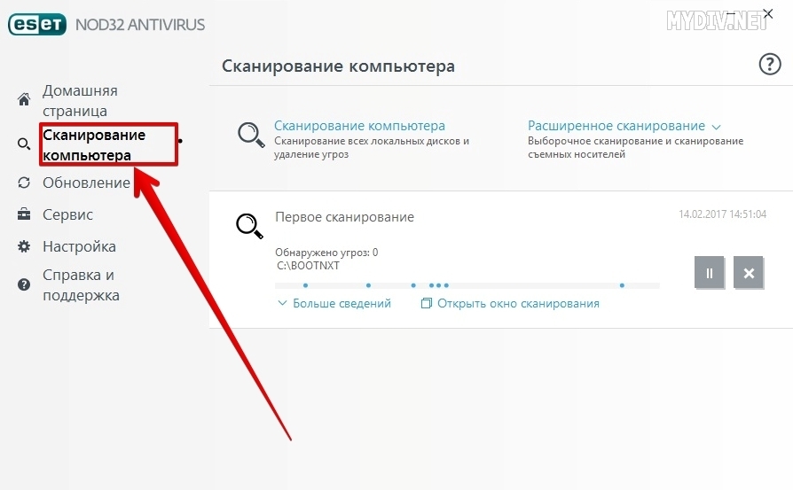Поздравляем. Вы установили антивирус. Теперь пришло время протестировать его работу. Кликаем на вкладку Сканирование компьютера