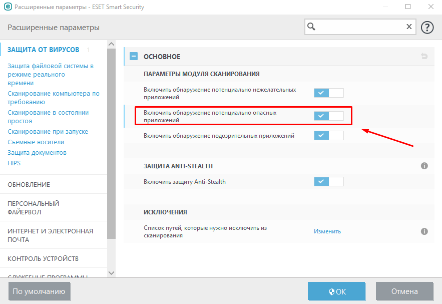 2. Здесь можно включить обнаружение потенциально опасных .