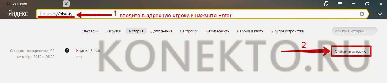 Скопировать в адресную строку текст browser://history и нажать клавишу Enter. На открывшейся странице журнала посещенных сайтов кликнуть «Очистить историю».