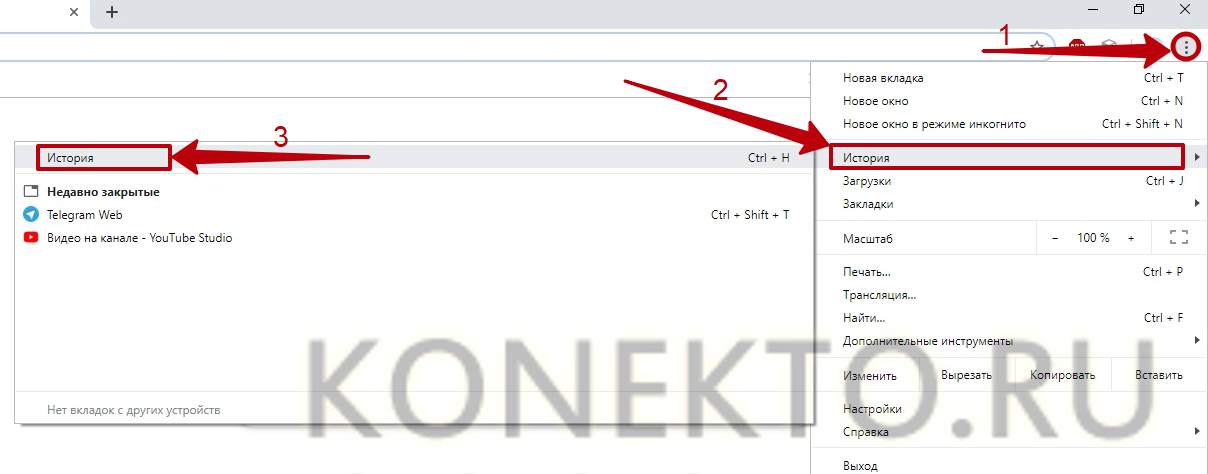 Нажать на кнопку «Настройка и управление» (в виде 3 точек), расположенную справа от адресной строки. Выбрать пункт «История» и еще раз кликнуть «История» в выпадающем списке.