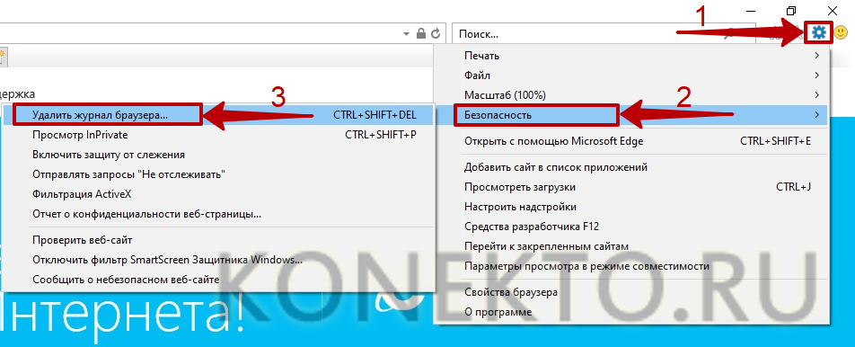 Нажать на кнопку «Сервис» (в виде шестеренки), которая находится справа от адресной строки. Перейти в раздел «Безопасность» и кликнуть «Удалить журнал браузера».