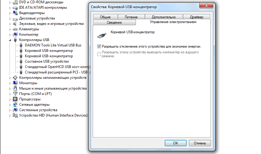 - Проверьте, что вы не превысили максимальную мощность, выдаваемую USB концентратором. Проверить потребляемую и доступную мощность можно в свойствах USB хаба в диспетчере оборудования. (Диспетчер устройств-> Контроллеры USB -> Корневой USB концентратор -> Свойства -> Питание).
