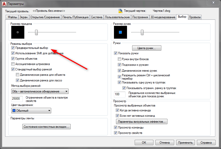В неких ситуациях может посодействовать последующее. Откройте характеристики Автокада и на вкладке «Выбор» отметьте галочкой пункт «Предварительный выбор».